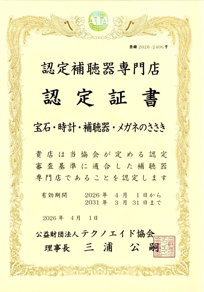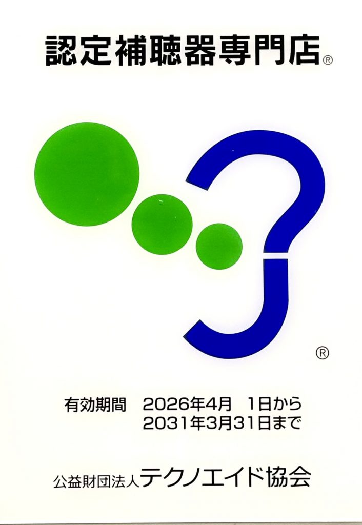 2026年4月1日よりテクノエイド協会から認定補聴器専門店の認定をいただきました