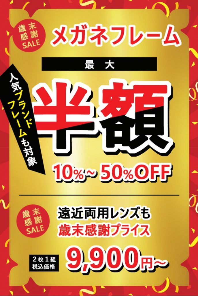 歳末感謝SALE 開催中!メガネフレーム最大半額!